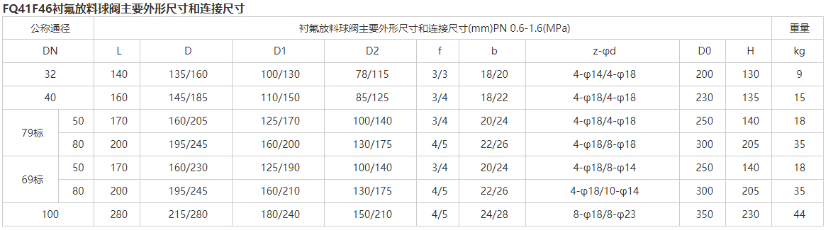 FQ41F46襯氟放料球閥采用氟塑料襯里技術,閥體采用熔模精密鑄造,強度高、外觀光潔,與液體接觸的過流部件全部為氟塑料,因此適用在-50℃~150℃的各種濃度的水、化工腐蝕品、強氧化劑,f46用于各種濃度的強堿有機溶劑以及其它腐蝕性氣體、液體介質(zhì)的管路上使用。
