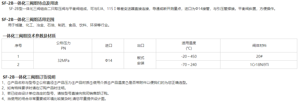 沃茈閥門(上海)有限公司生產(chǎn)銷售的SF-2B一體化三閥組由二只取壓閥與平衡閥組成,可與EJA、115I等差變送器直接連接,導(dǎo)通或斷開測(cè)量點(diǎn),進(jìn)口為φ14接管,與引壓管焊接。平衡閥斜置,方便操作。